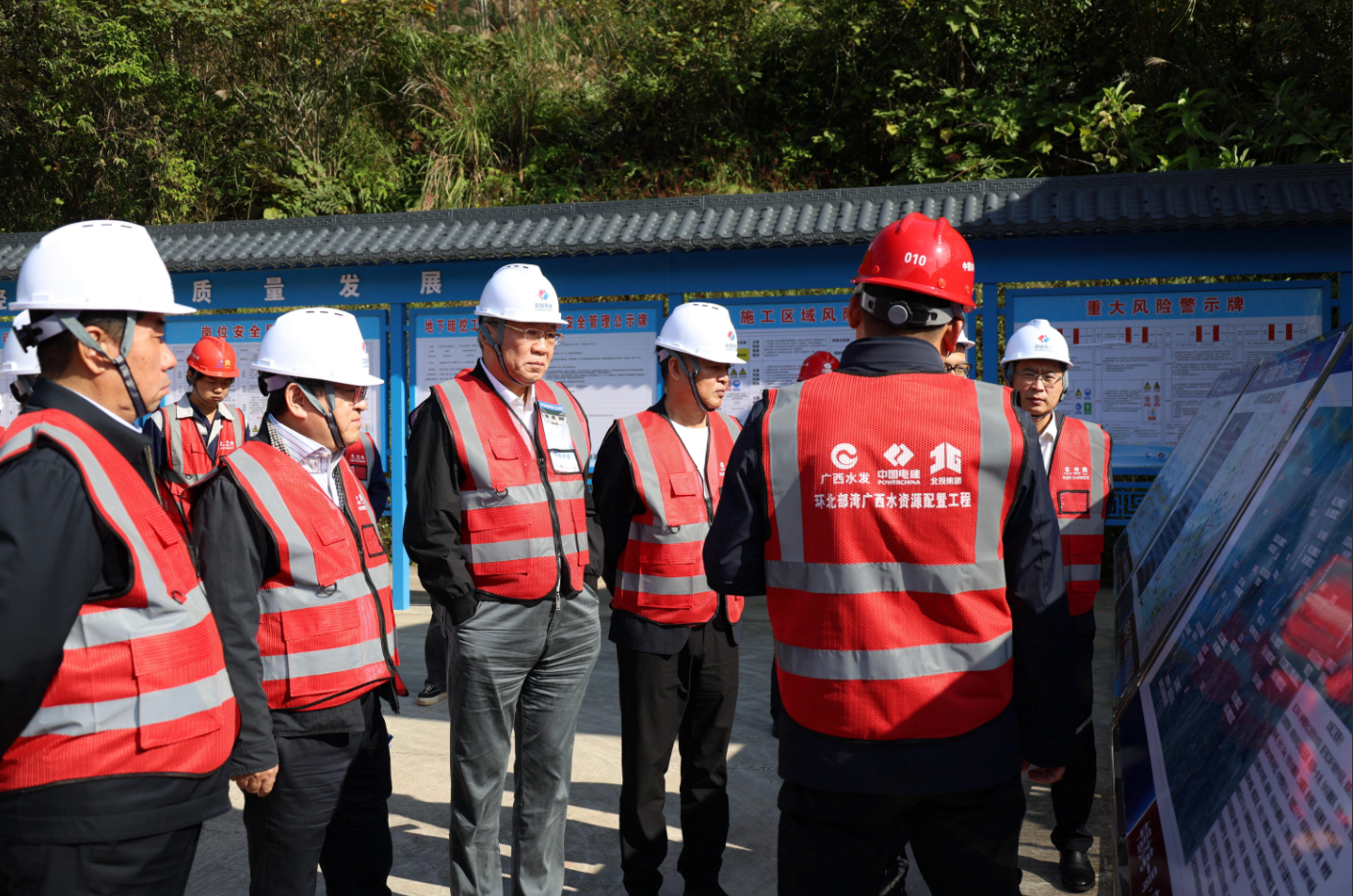 11月13日,中國(guó)電力建設(shè)股份有限公司獨(dú)立董事張兆祥、孫子宇、張國(guó)厚、竇皓一行赴公司承建的環(huán)北部灣廣西水資源配置工程B2標(biāo)段開(kāi)展工作調(diào)研。股份公司有關(guān)高管、部門(mén)負(fù)責(zé)同志,南方區(qū)域總部有關(guān)負(fù)責(zé)同志等陪同調(diào)研。 上午,調(diào)研組一行深入項(xiàng)目上繞隧洞、木塘隧洞施工現(xiàn)場(chǎng)進(jìn)行實(shí)地考察,詳細(xì)了解項(xiàng)目施工進(jìn)展、質(zhì)量管控及安全文明施工情況。下午,調(diào)研組在水電一局項(xiàng)目部營(yíng)地召開(kāi)座談交流會(huì)。南方區(qū)域總部就區(qū)域總部建設(shè)情況、水電一局廣西環(huán)北項(xiàng)目部就項(xiàng)目履約進(jìn)展情況等分別作了專(zhuān)題匯報(bào)。同時(shí),圍繞推動(dòng)項(xiàng)目高質(zhì)量履約、提升品牌效益等主題,與會(huì)人員進(jìn)行了充分交流。 調(diào)研組對(duì)水電一局在復(fù)雜地質(zhì)條件下高效推進(jìn)項(xiàng)目建設(shè)、嚴(yán)格落實(shí)生態(tài)環(huán)境保護(hù)的做法給予充分肯定,稱(chēng)贊公司廣西環(huán)北項(xiàng)目為生產(chǎn)抓得好、生活保障好、精神面貌好、綜合效益好的“四好項(xiàng)目”。調(diào)研組指出,環(huán)北部灣廣西水資源配置工程事關(guān)區(qū)域供水安全和生態(tài)安全,是服務(wù)國(guó)家重大區(qū)域協(xié)調(diào)發(fā)展戰(zhàn)略的重要舉措。希望水電一局廣西環(huán)北項(xiàng)目團(tuán)隊(duì)嚴(yán)守質(zhì)量安全底線,強(qiáng)化科技創(chuàng)新支撐,提升數(shù)字化管理水平,高標(biāo)準(zhǔn)完成各項(xiàng)建設(shè)任務(wù),以?xún)?yōu)質(zhì)履約實(shí)現(xiàn)“以現(xiàn)場(chǎng)保市場(chǎng)”目標(biāo)。同時(shí),要注重生態(tài)保護(hù)與工程建設(shè)協(xié)同推進(jìn),努力打造經(jīng)得起歷史和人民檢驗(yàn)的精品工程、示范工程。 水電一局六公司有關(guān)負(fù)責(zé)人、廣西環(huán)北項(xiàng)目部經(jīng)理等參加上述調(diào)研活動(dòng)。 |