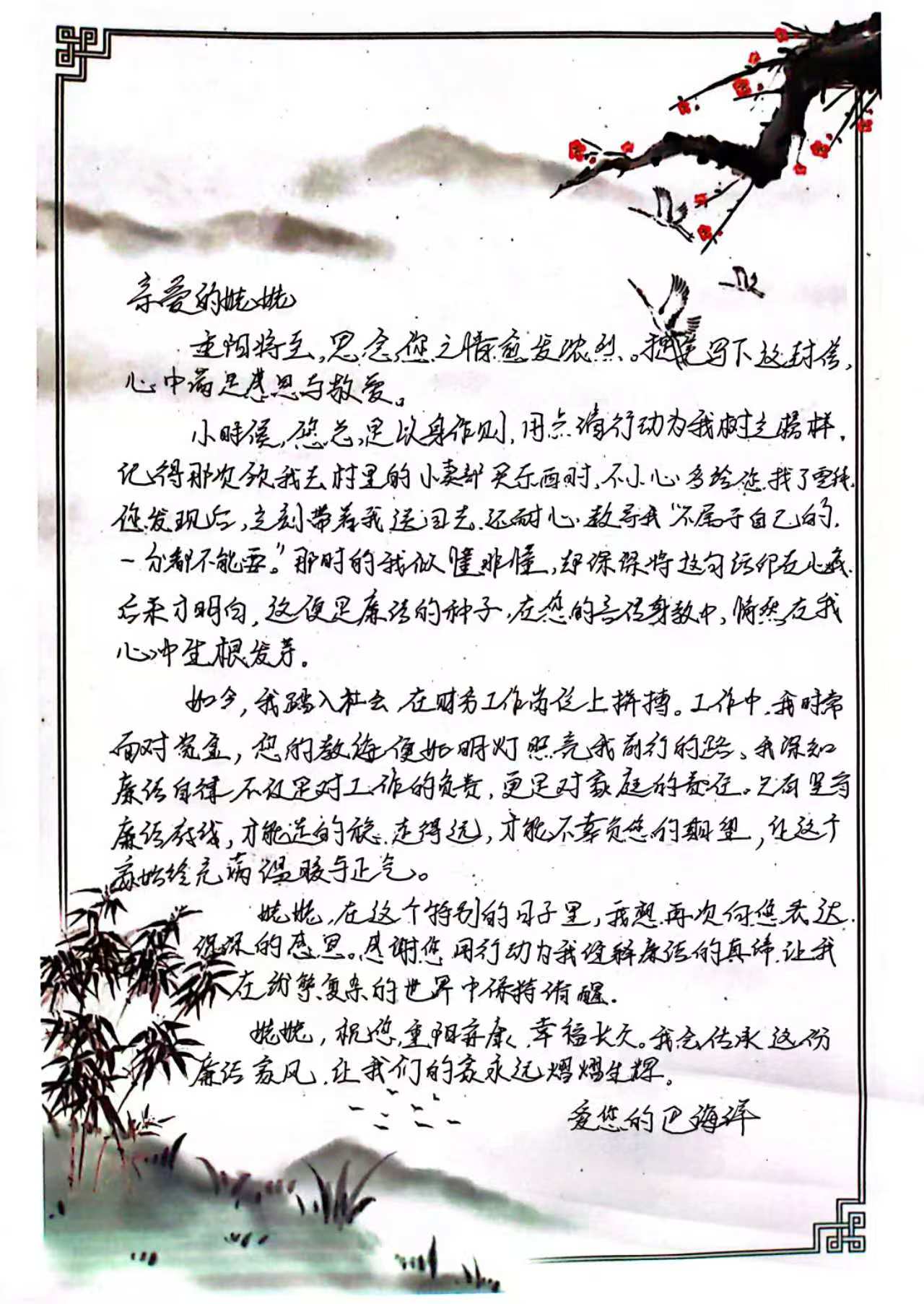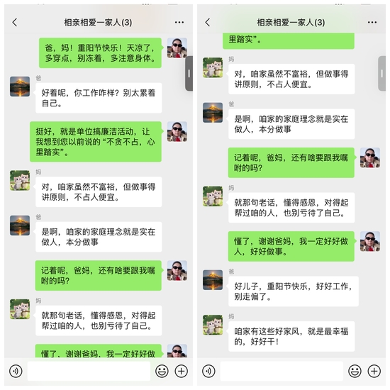 這個重陽節,七公司有點不一樣。 沒有嚴肅的會議,脫離枯燥的宣講,取而代之的是一封封帶著溫度的家書、一段段發自內心的視頻、一句句融入親情的廉潔寄語。當“廉潔教育”遇上“重陽感恩”,七公司紀委精心策劃的一場走心又暖心的廉潔主題活動正溫情上演,讓這個秋天不僅有金風送爽,更有“廉”意暖心。 作為七公司紀委在廉潔教育形式上的又一次創新探索,繼“清風講堂”、廉潔演講比賽、主題征文等活動之后,本次“廉潔家書”活動更進一步打破了傳統廉政教育的固化模式,將教育場景從單位延伸至家庭,將紀律要求融入親情交流,推動廉潔文化建設真正“活”起來、“暖”起來。 當廉潔遇見家書,紙短情長話初心 “爸,您總說‘吃人家的嘴軟,拿人家的手短’,這句話我一直記在心里。如今我在崗位上,也時刻提醒自己要像您一樣清清白白做人、干干凈凈做事。”一名黨員在寫給父親的家書中這樣說道。 活動自啟動以來,迅速點燃了全體職工的熱情。從機關辦公室到項目一線,從70后到90后,大家紛紛以手寫書信、微信長文、錄制視頻等方式,向父母長輩表達感恩之情,也在親情互動中傳遞著對廉潔初心的堅守。不少員工表示,這是他們第一次把“廉潔”這個詞寫進家書,卻發現自己對廉潔的理解從未如此真切而深刻。一名黨員領導干部手持剛完成的家書感慨,“給父親寫信的時候,想起他一輩子在崗位上清廉辦事的樣子,突然覺得廉潔不是一句口號,是我們家代代相傳的‘傳家寶’。” 形式不拘一格,真誠才是最好的表達 為了讓更多職工輕松參與、真誠表達,本次活動不設固定形式,鼓勵大家選擇自己最擅長、最自然的方式傳遞心聲。有人鋪開信紙,用筆墨重溫書信往來的溫情時光;有人編輯微信長文,讓牽掛跨越千里、瞬間抵達;也有人錄制視頻,面對鏡頭說出那些平時羞于表達的感謝與承諾。 工程部職工王建新在寫給姥姥的信中樸實的承諾:“憑良心把活干好,搞好工程質量,也護好自己的清白。” 安全環保部主任屠光雪在寫給父母的家書中真情回憶:“您二老常說‘莊稼要根正苗壯,人要心正行端’,我一直都記得。” “原來廉潔教育也可以這么接地氣、有溫度!”許多員工在參與后感慨,這樣的活動讓他們在表達孝心的同時,也重新認識了廉潔的意義——它不僅是紀律要求,更是一種融入血脈的家庭教養和人生底色。 廉風化雨潤家風,紙短情長見真心 截至目前,活動已收到各類廉潔家書作品30余件。這些作品情感真摯、形式多樣,既有對父母教誨的深切感恩,也有對廉潔從業的堅定承諾。 黨群工作部主任唐麗麗在視頻中說道:“媽媽,我在這邊一切都好。您一直教導我說要:廉立身,勤作人。這句話始終刻在我的心里。”這樣的表達,不僅感動了家人,也感染著身邊的每一位同事。 南四環路項目工程部員工張健軍一家三口微信群里字字叮囑的是父母的教誨:“不貪不占,心里踏實”“實在做人,本份做事”。 隨著作品在公司的集中展示,廉潔家風的影響力也在持續擴散。一句句質樸的家訓、一段段真摯的告白,讓“廉”的種子在家庭生根,讓“潔”的底色在親情中沉淀,真正實現了“教育一個職工,帶動一個家庭,影響整個團隊”的浸潤式教育效果。 家書載廉傳清風,互動凝聚正能量 這個重陽,七公司以一封封家書為媒,讓廉潔文化在親情互動中自然生根,在代際傳承中持續發酵。紙短情長,言淺意深,每一封家書都是一次溫暖的提醒,每一次表達都是一次初心的重溫。 從“清風講堂”的線上學習,到“廉潔家書”的親情傳遞,七公司紀委始終在探索更有溫度、更接地氣、更具感染力的廉潔教育新路徑。不斷推動廉潔教育從“說教式”向“沉浸式”、從“被動接受”向“主動參與”轉變,讓清廉理念真正入腦入心、化風成俗。 本次活動雖已告一段落,但廉潔家風的傳遞仍在延續。歡迎大家在評論區分享你的家風故事,點贊轉發,一起傳遞這份“家書里的清廉”,讓溫暖延續,讓正氣長存! |